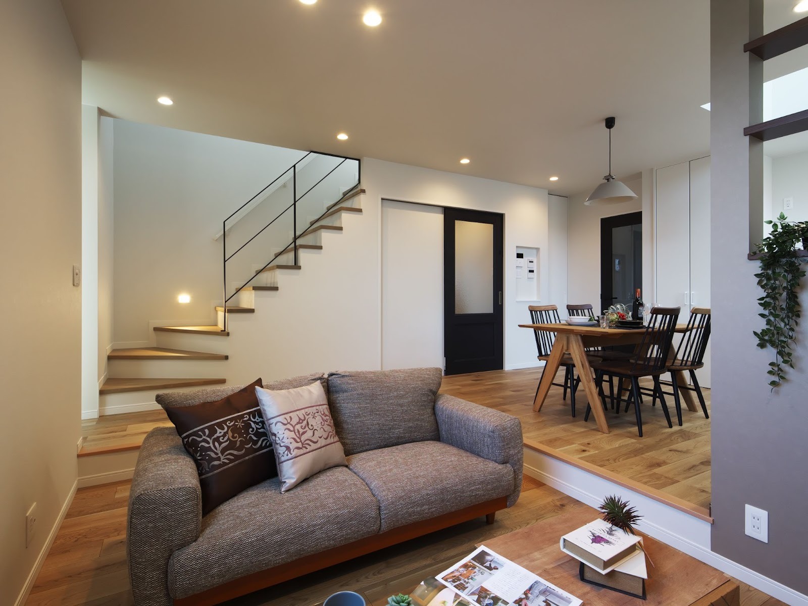 ダイニングキッチンはブラックを効かせた落ち着きのあるデザインでまとめ、リビング側は間接照明や大きな開口でやわらかく見せています。