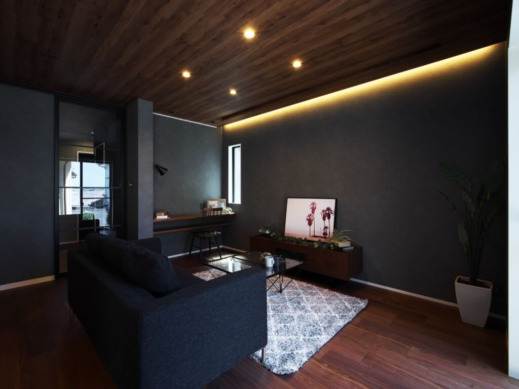 新築時は図面だけで照明位置を決めてしまいがちですが、このように「そこに座ったときどう感じるか」まで考えられていると、完成後の満足度は大きく変わります。壁際のカウンタースペースにも注目です。リビングの一角にワークスペースや書き物スペースを設ける場合、全体の雰囲気を優先しすぎると手元が暗くなり、使いにくさが後悔につながることがあります。この事例では、空間全体の落ち着いたトーンを崩さずに、必要な場所にはきちんと明るさを確保する考え方が貫かれており、実用性の面でも非常に参考になります。