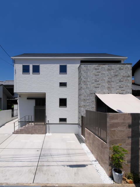 青空とエクステリアに映えるコントラストが美しい外観